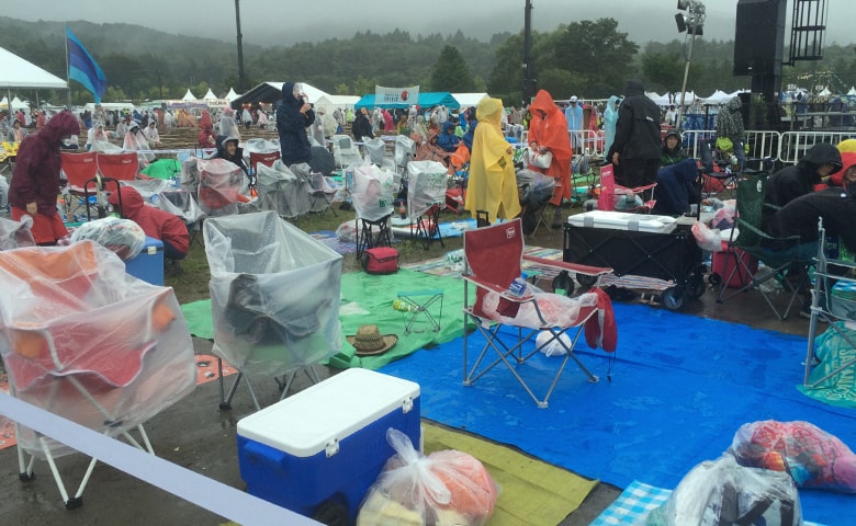 大半のフェスは、安全面から傘の持ち込みを禁止しているため、レインスーツかレインポンチョが必需品となります。