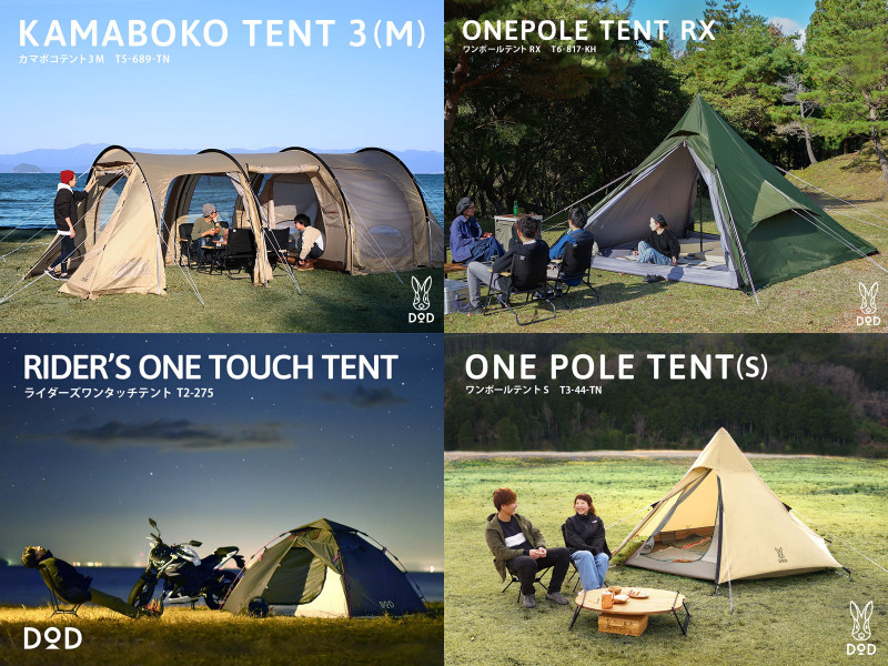 広いリビングスペースも欲しいけどタープ張るのは面倒、ってファミリーやグループにはカマボコテント、女子だけだからなるべく設営簡単で軽いのが良いって子にはワンポールテント、ツーリングやフェスで使うって場合はコンパクトに持ち運べてパパっと立てられるライダーズシリーズのワンタッチテントをおすすめすることが多いかな。