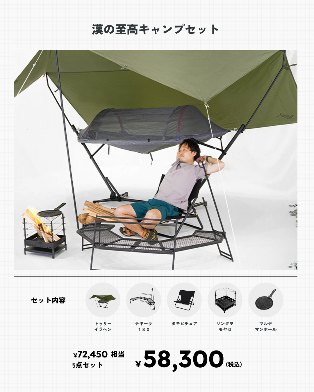 そんな「トゥリーイラヘン」に「タキビチェア」、「テキーラ180」、「リングヲモヤセ」、「マルデマンホール」が付いた5点セットで58,300円(税、送料込)。 それぞれを単品で購入した場合は72,450円(参考価格ベース)なので、約20%オフのおトクセットです。 DOD商品の中でもクセ強アイテムが集まっていますが、遊び心たっぷりな自由なハンモック泊をお楽しみいただけるかなと思います。 ご購入はこちら → https://store.dod.camp/c/item/set10_g