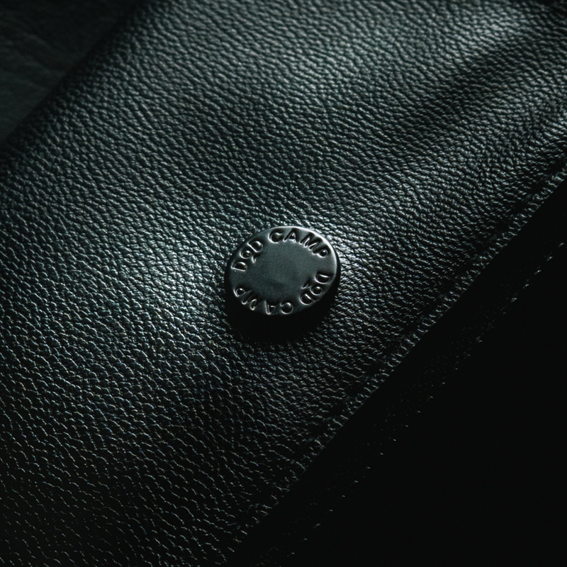 財布正面の丸いカシメ部分には、「DOD CAMP」の文字がエンボス加工で入っています。