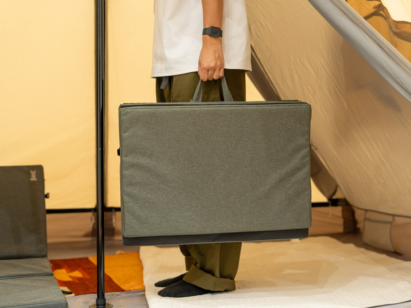 車への積載やキャンプ場への持ち運びも簡単。女性やキャンプ初心者の方でも負担なく扱え、スマートな設営・撤収が可能です。手軽に快適なお座敷リビングを完成させたい、そんなあなたの願いを叶えます。