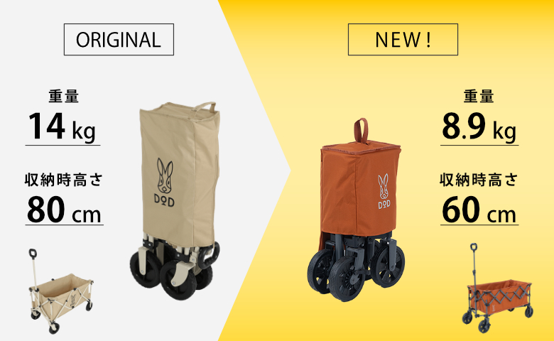 アルミ合金製のフレームを採用したことにより、同等サイズのスチール製キャリーワゴンと比較して約30%軽量化。約10kgの重量で女性でも扱いやすく車への積み込みもラクラクです。