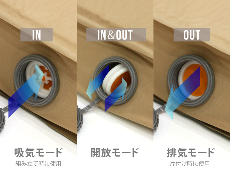 マット内部にはウレタンが入っているため、バルブを開けば自動的に膨張します。バルブを開放している間に食事の準備や遊びに時間を使うことができます。
