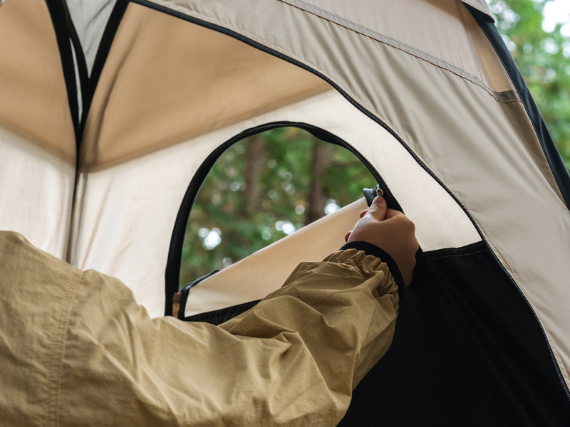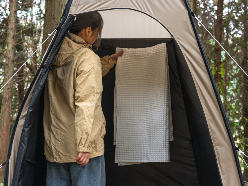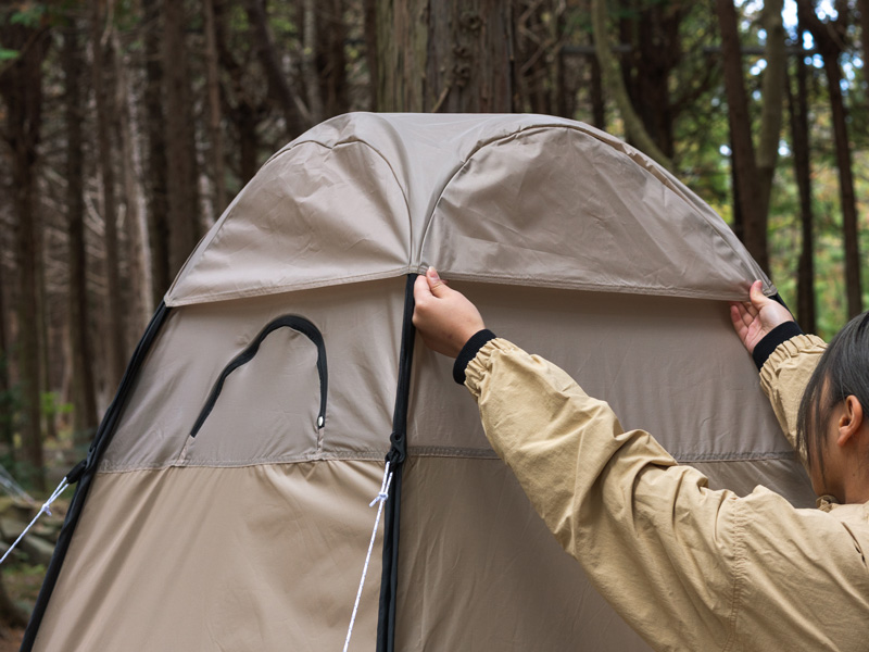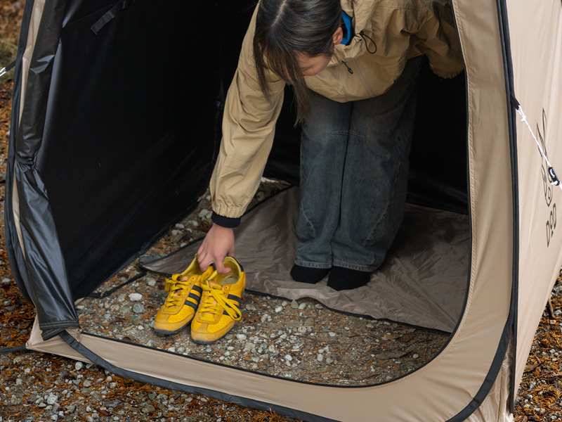 一方で、肩から上は光を取り込む非遮光生地を採用。プライバシーは完全に守りながら、日中はテント内が真っ暗にならず、手元が見やすいという快適性も両立しました。