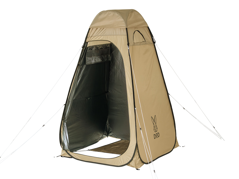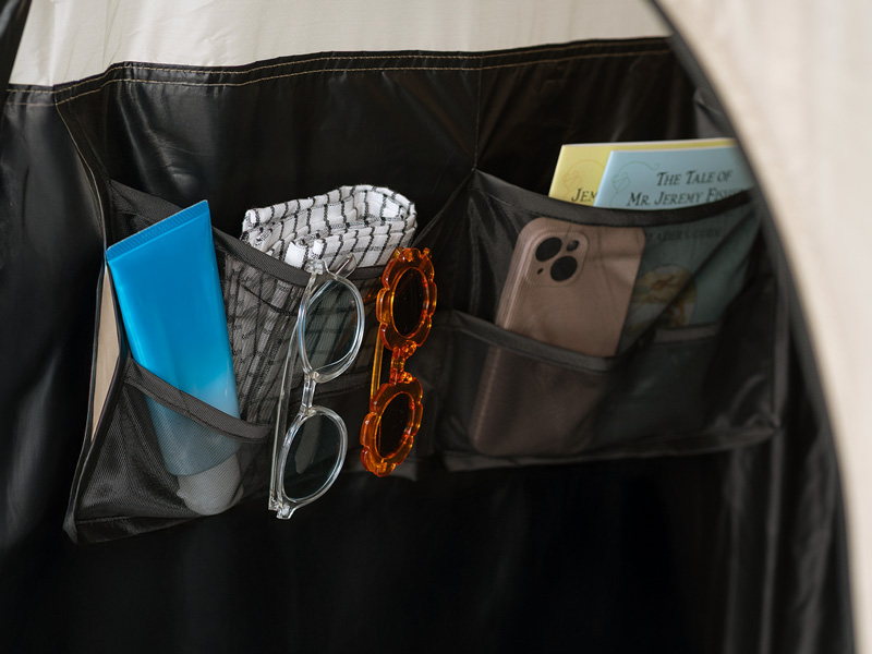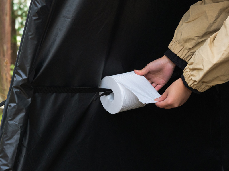 本体に縫い付けられた一体式のフロアシート、タオルや服を掛けられるベルト、スマホや小物を入れるのに便利なポケット、さらにはトイレットペーパーを設置できる専用ホルダーまで。快適に過ごすための機能を加えています。