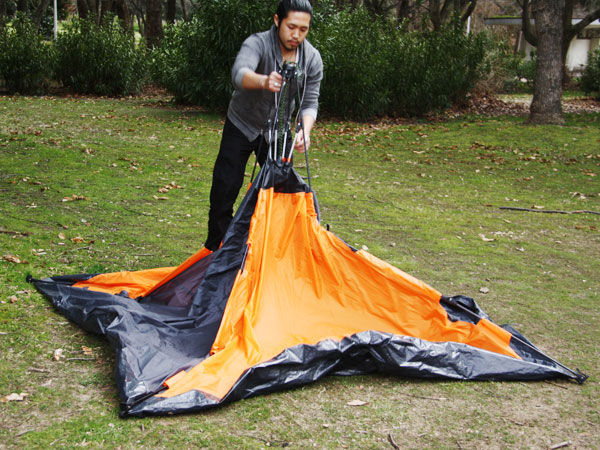初心者や女性の方でも簡単、瞬時に設営することができるワンタッチテント。設営方法はキャリングバッグから本体を取り出し、地面に広げてテント上部の2本のロープを引っ張るだけ。ポールを組み立てる作業や、分解の作業は一切不要です。