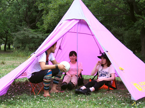 設営の簡単さと収納時のコンパクト性を兼ね備えるティピー型スタイリッシュテント(5人用)。