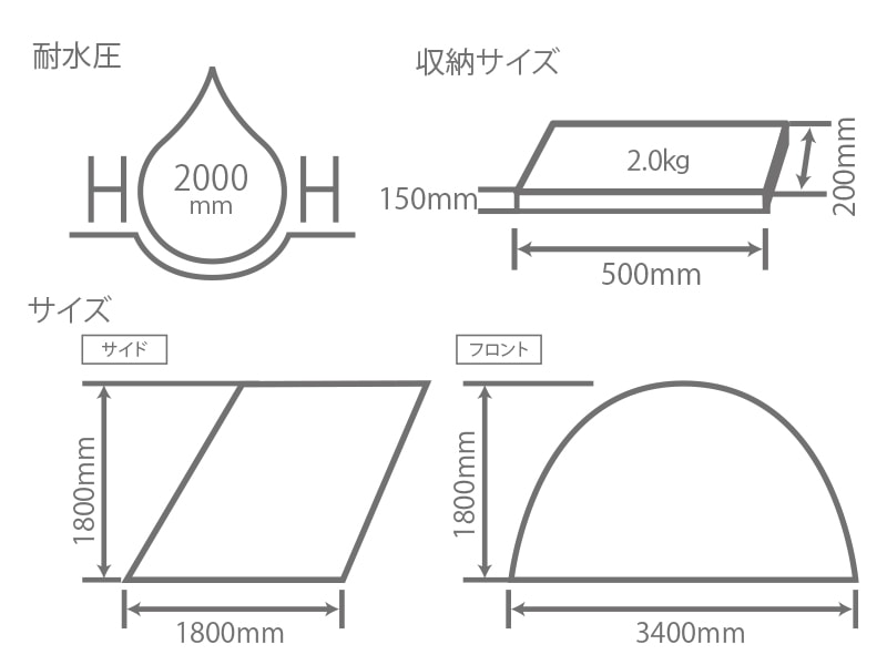お客様がお使いのモニターの設定や天候・照明の当たり具合などにより、実物の色味と異なって見えることがございます。 - テント生産時にJIS L 1092(ISO811)方式にて耐水圧試験を行い、計測箇所の平均値ではなく、最低値が記載値以上となるように耐水圧を設定しています。